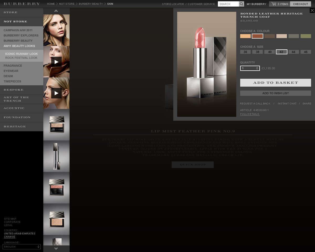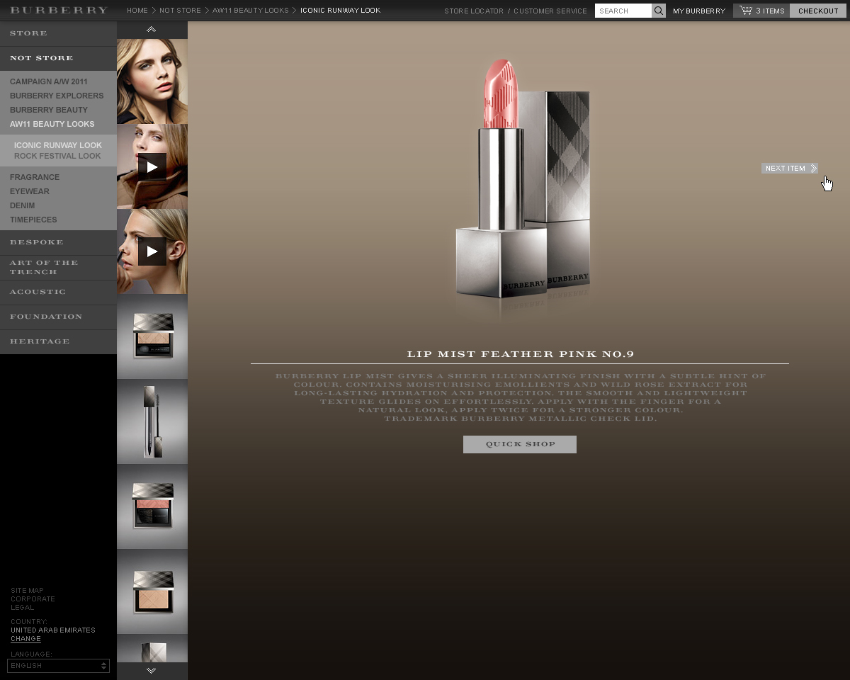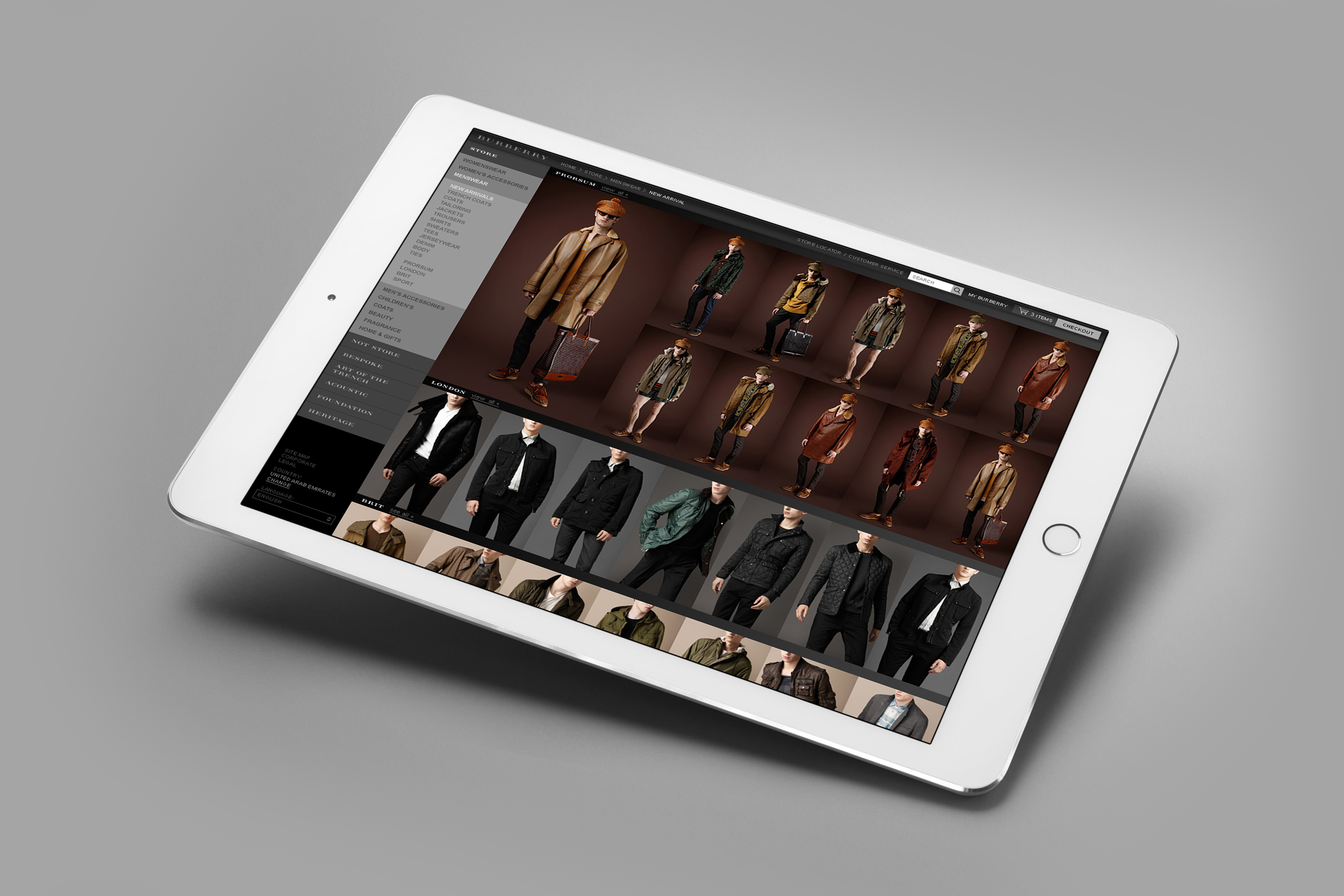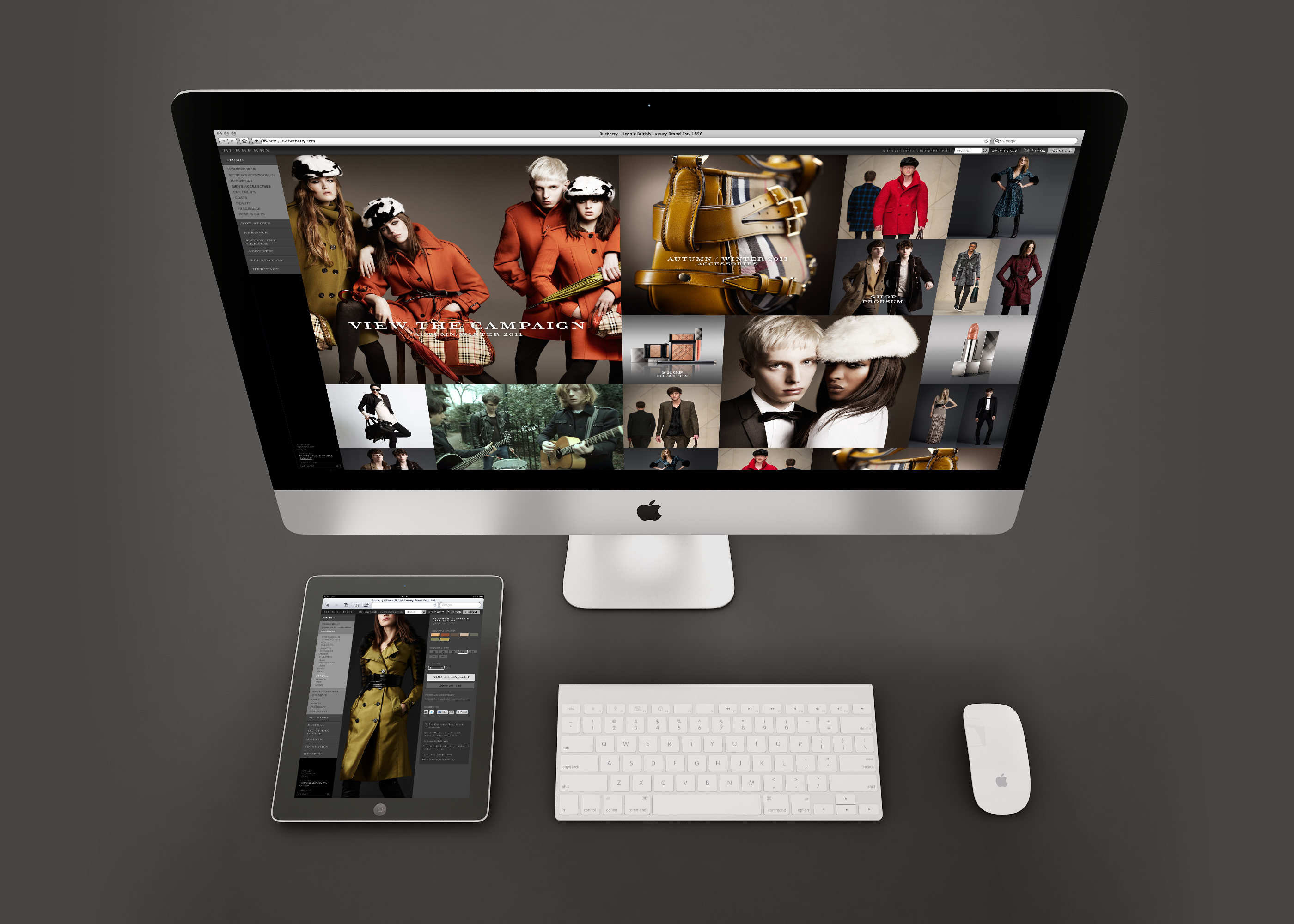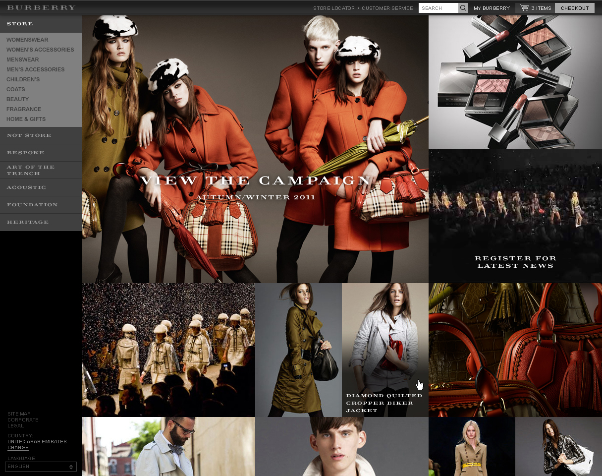Burberry used to have had a desktop only website. It was built using Flash and had no e-commerce platform. I was hired to re-design the site for multiple screen sizes. It was not to be built in Flash anymore, but it would now have a new online store.