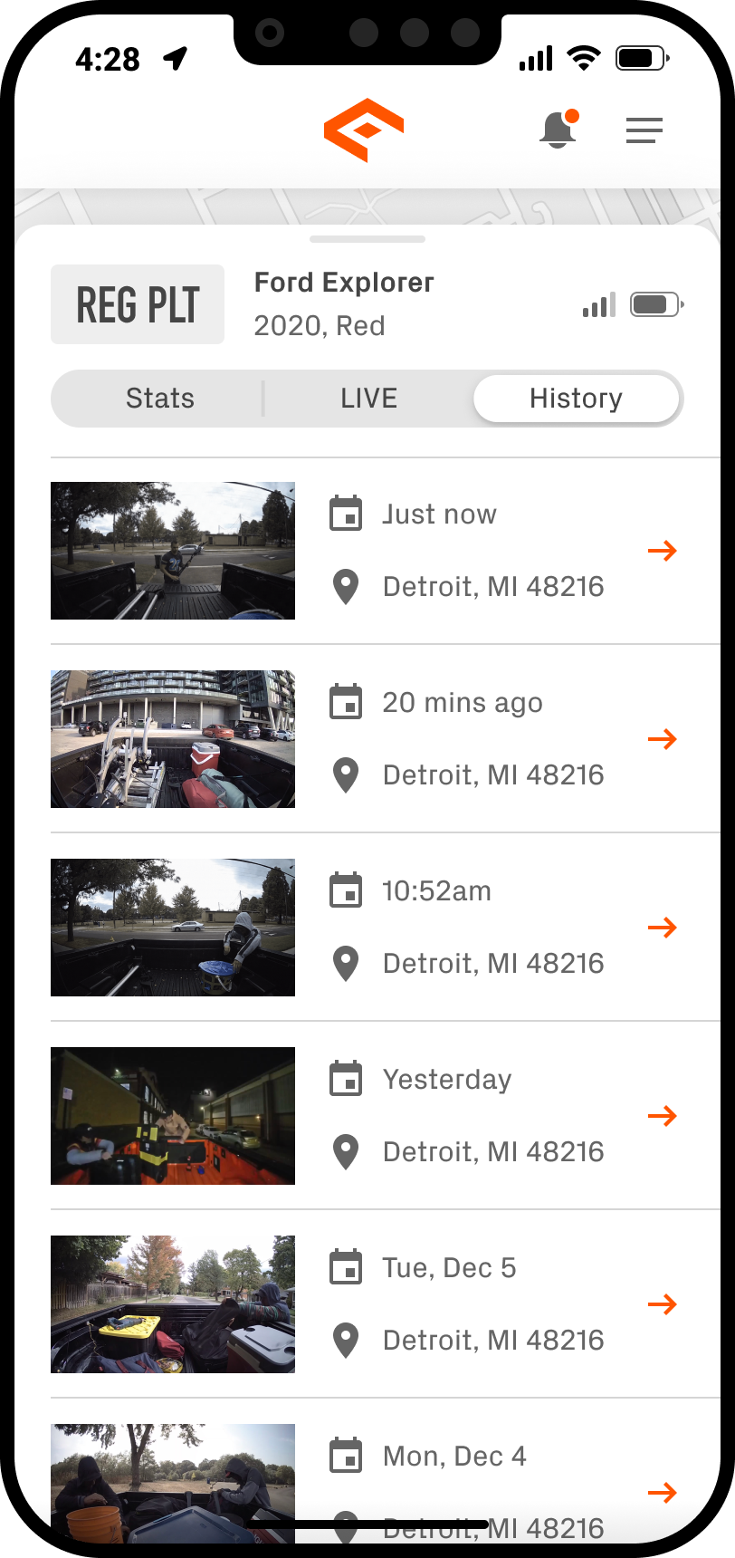 The software comes in the form of a mobile App. The App can notify a user when a threat is detected in or around their truck bed. Clicking on a notification opens the App on the LIVE stream tab, where a user can view live footage and hear live activity from their truck bed. All footage that is collected is then automatically uploaded in to the cloud and stored securely. This footage can be viewed at a later time, and be shared with law enforcement and insurance providers.