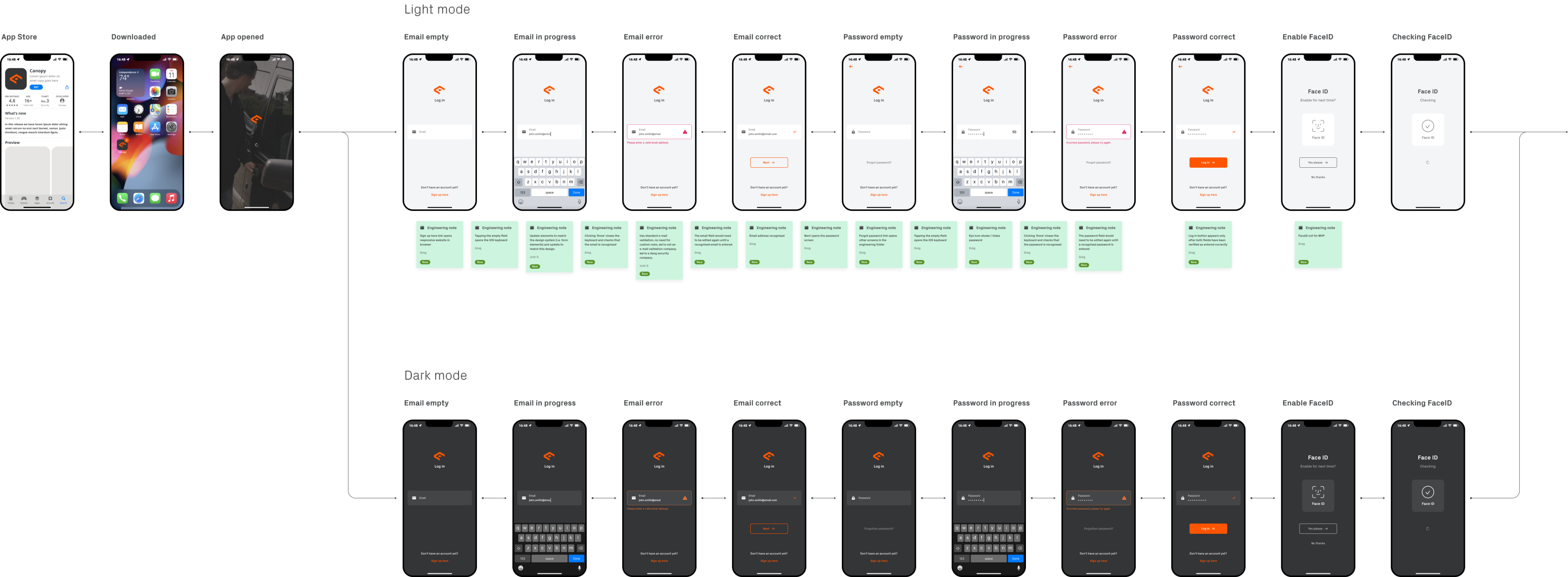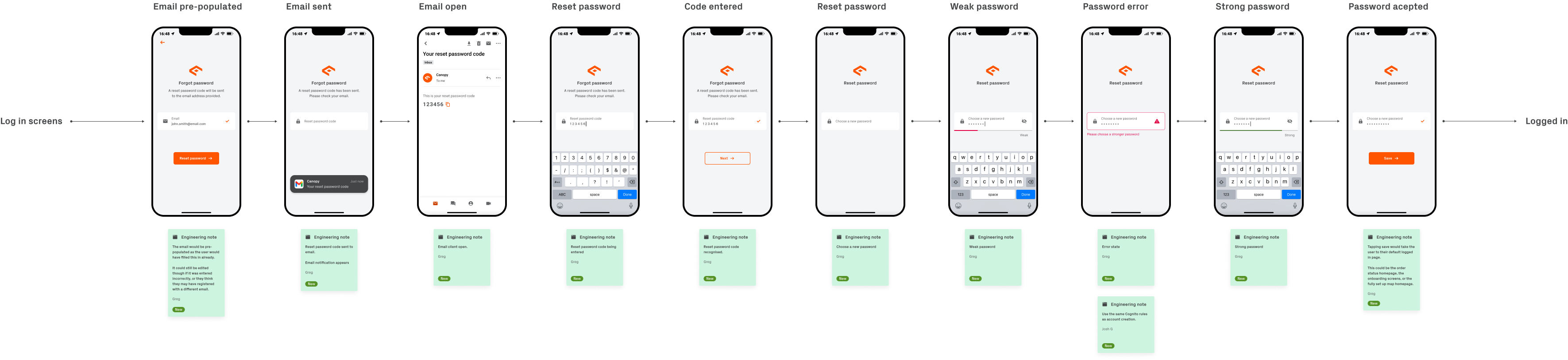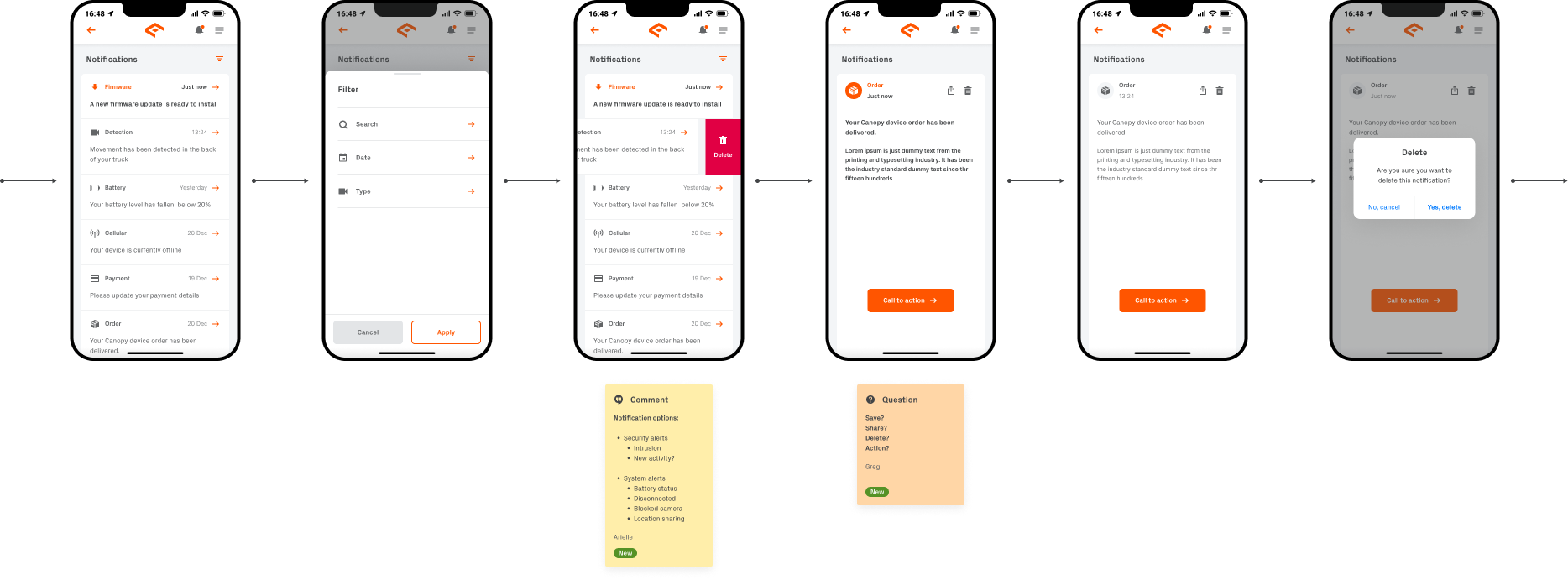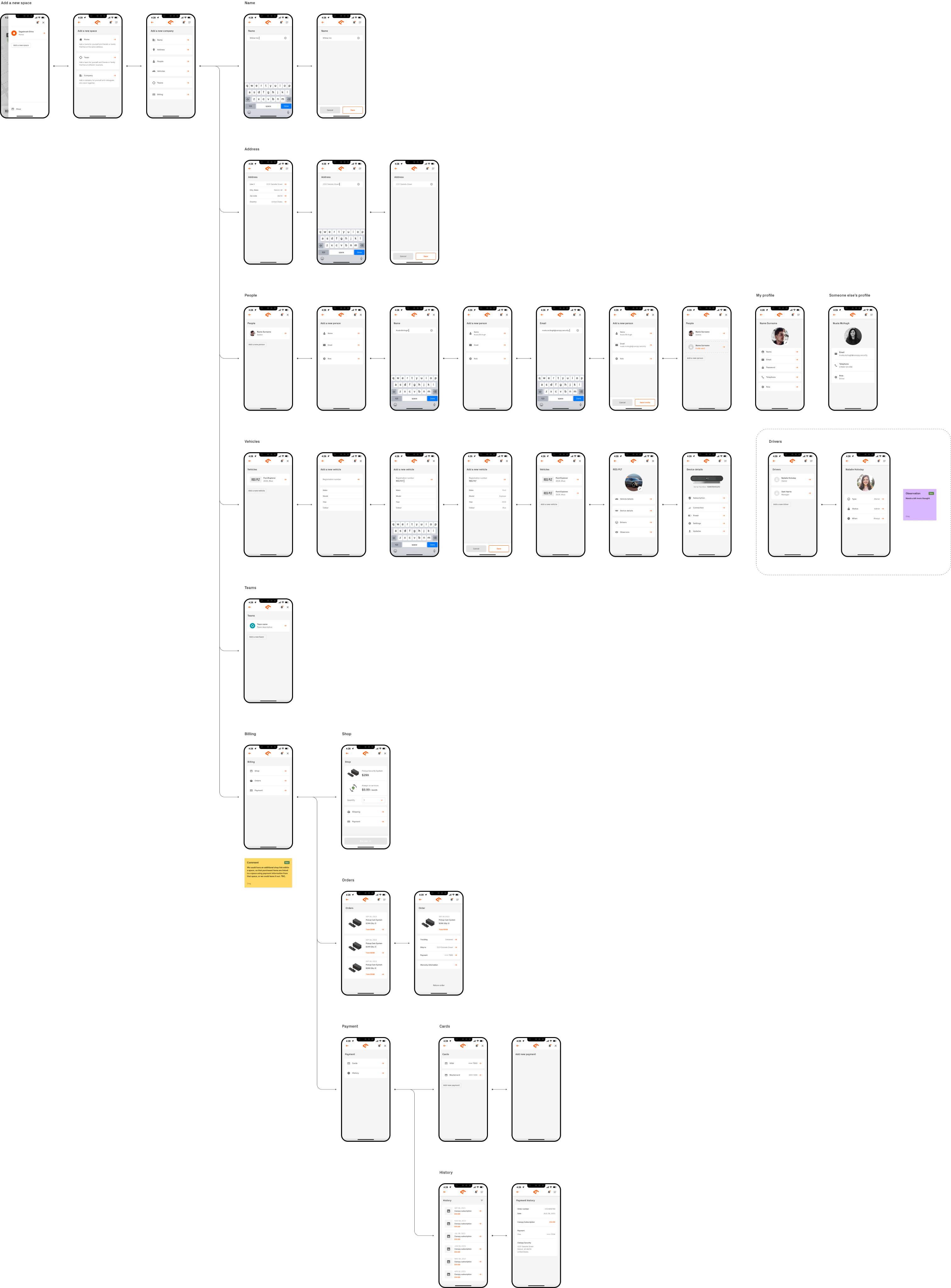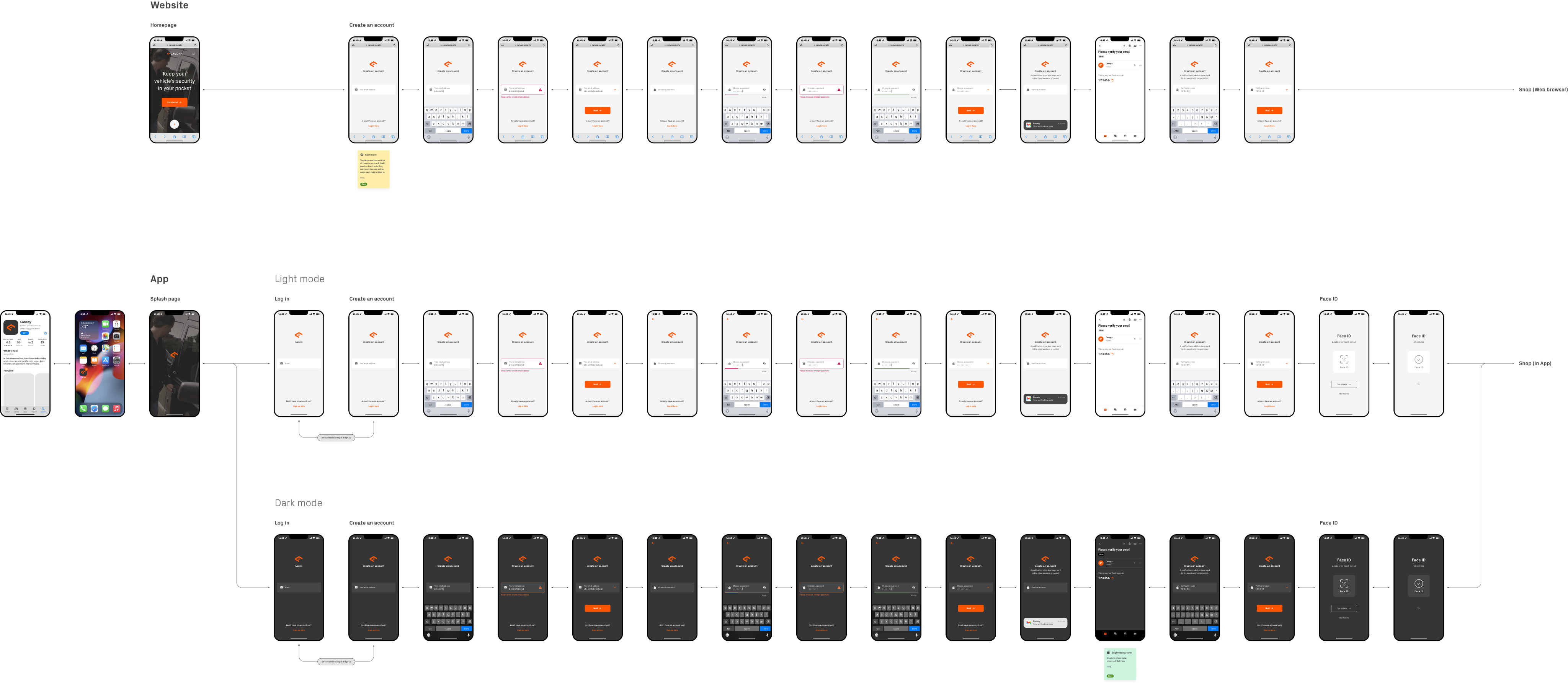The key deliverables were broken down in to sixteen different sections; Sign up, Compatibility, Shop, Log in, Forgot password, Order status, Onboarding, Main screens, Event report, Notifications, Account, Vehicle, Device, Service, Support, and Website.