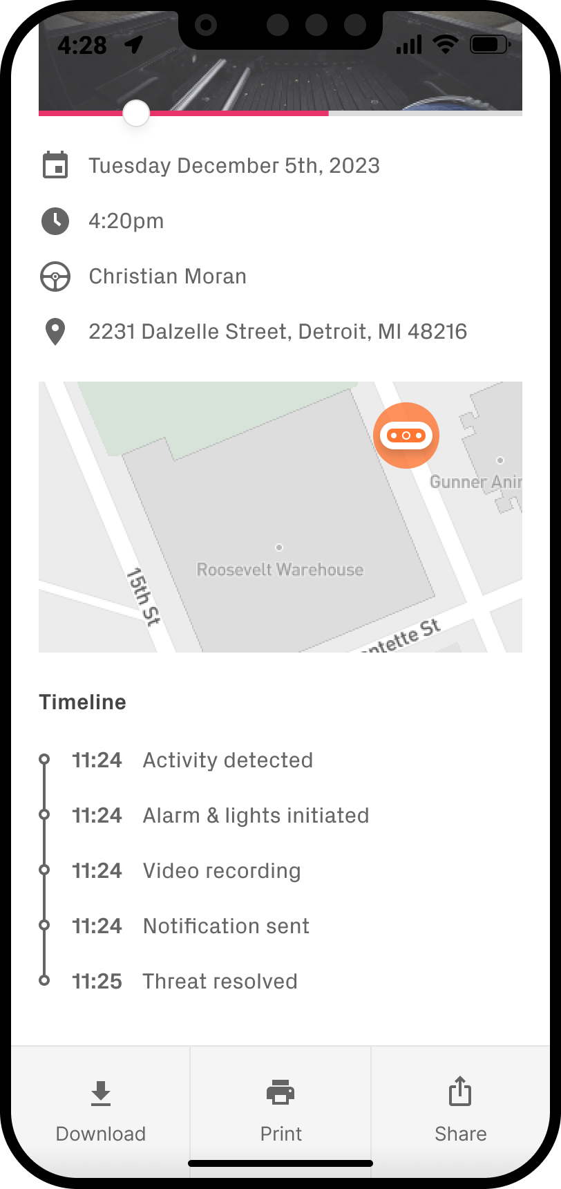 As well as capturing all event activity and uploading the video and audio footage to the cloud, every potential threat also has its own report screen, where the vehicle owner can see exactly what happened and where, and what the final outcome was.