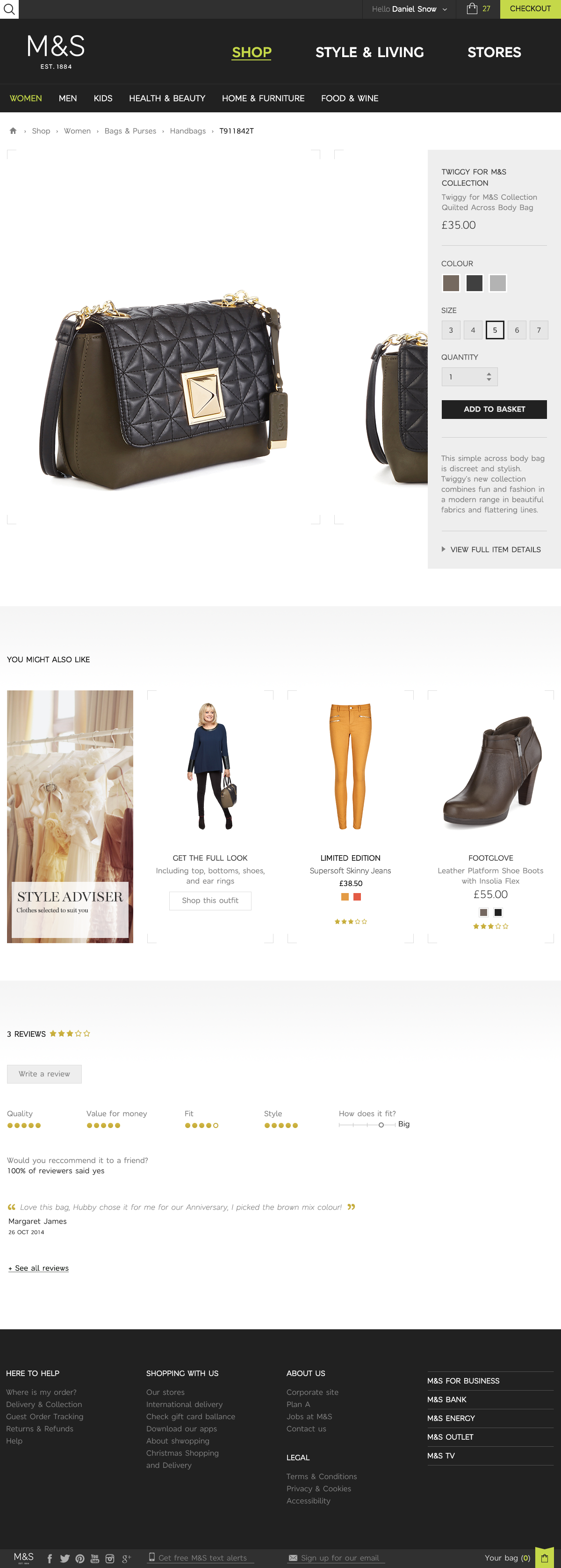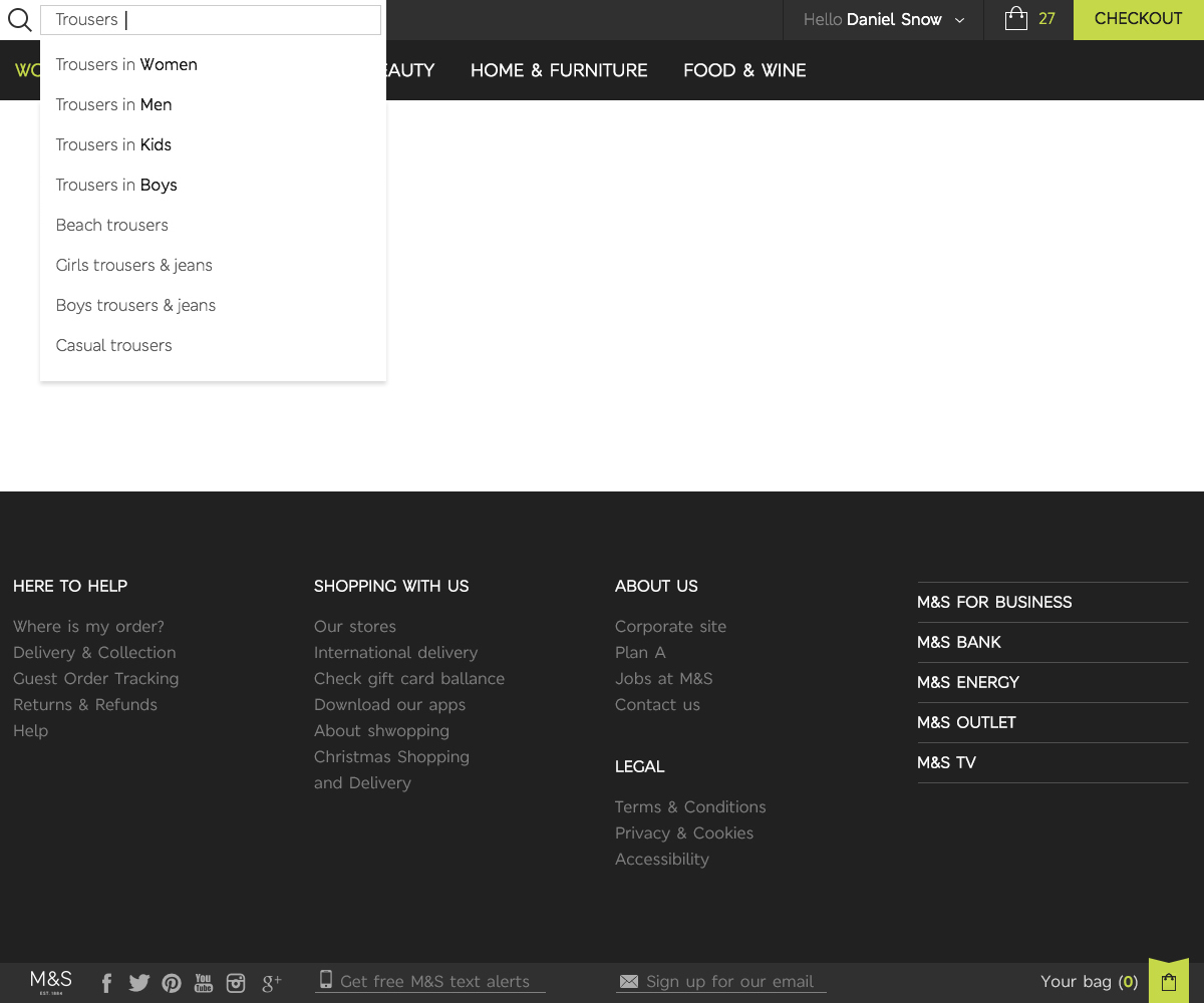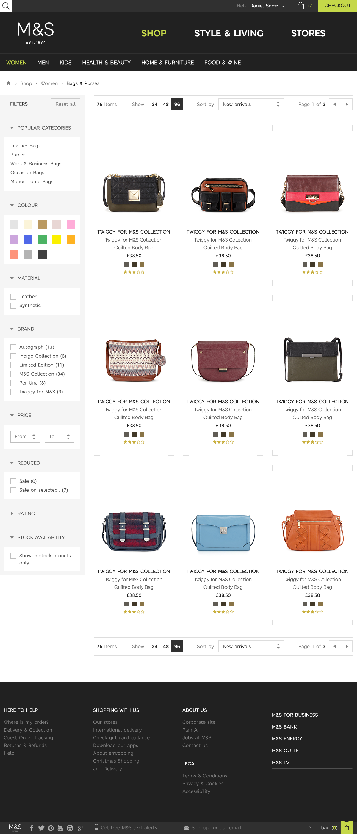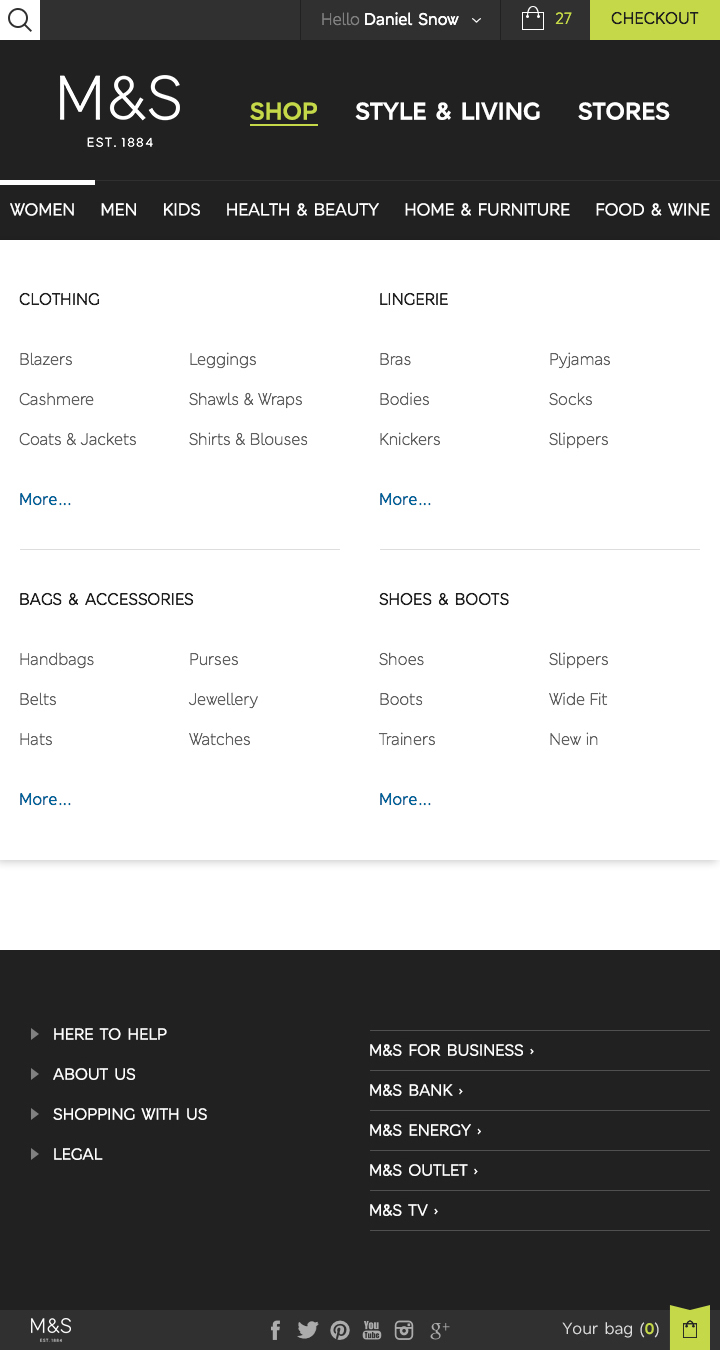 The homepage now consists of only four parts. The feature area, shop, style & living, and stores. They are separated in to clear, easy to digest vertical chunks of information. The user scrolls from one part to the next. The feature area will tie in with current marketing material. The user can click straight through to the main shop categories, therefore skipping a page in the user journey. They can browse the latest Style & Living editorial, or find a Store. A logged in user that has bought from M&S before can now go from home to checkout in only five clicks.