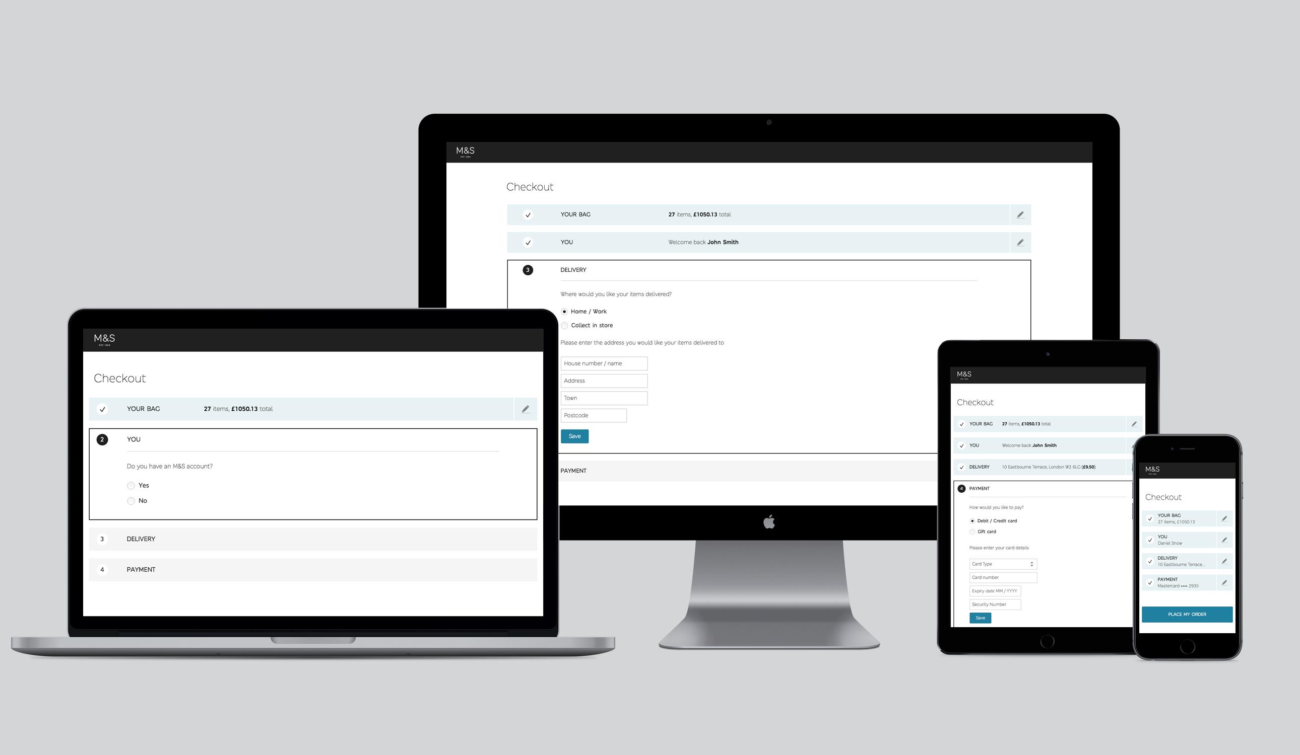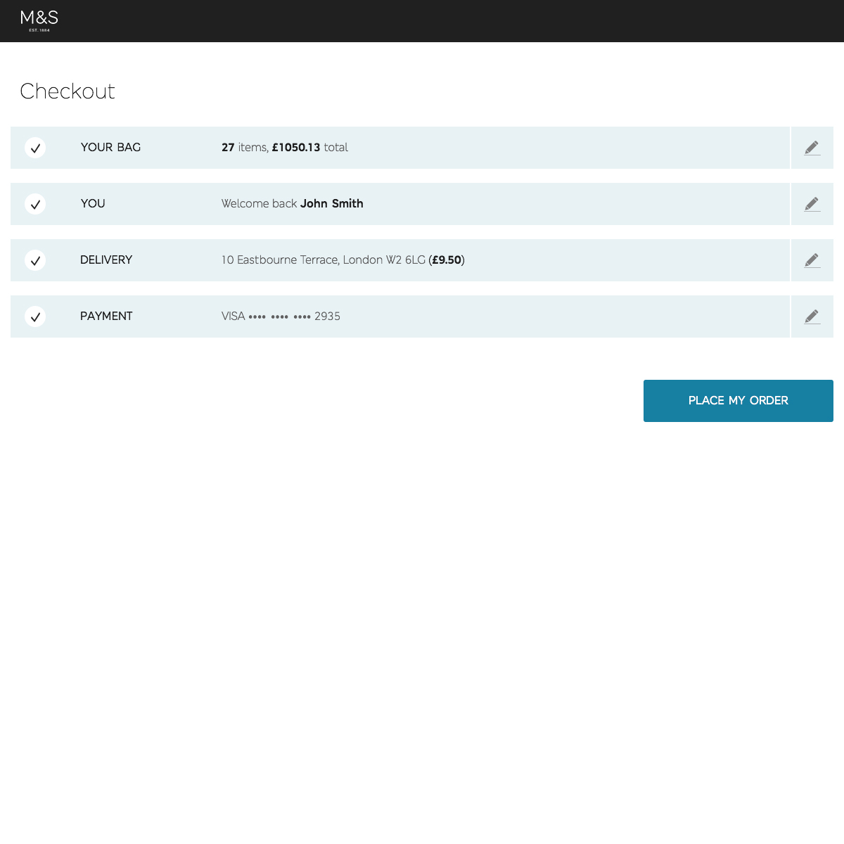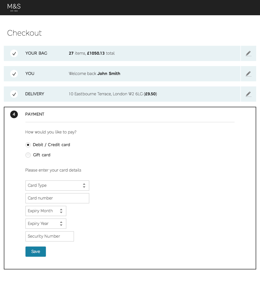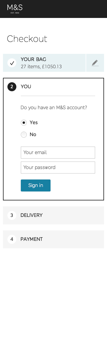 The checkout section is now on one page. It has been simplified to reduce dropout, and designed to work across all screen sizes. If a user is signed in and has bought from M&S before, they will be able to checkout with only one click. It is broken in to four areas; your bag, you, delivery, and payment. Content is delivered in a tailored way, reducing the amount of noise on the page.